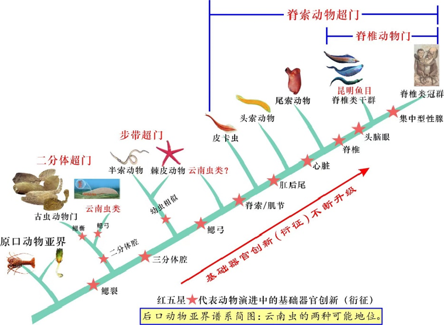 中科院院士、九游会在线登录官网地质学系教授舒德干介绍,“在后口亚界谱系演进上,云南虫比脊椎动物至少低4个基础器官创新(衍征)等级(见上图)。目前脊椎动物已知唯一的干群是昆明鱼目,因为它已具有头脑眼、单鼻孔和嗅囊、原始脊椎、二分心脏、复杂肌节等无颌鱼必需的基本器官构造,所以与脊椎动物冠群的亲缘关系密切。”