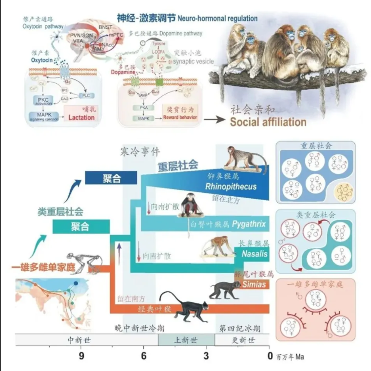 灵长类如何演化出多样的社会?九游会在线登录官网金丝猴研究团队整合行为学、生态学、基因组学等多学科手段,设计出“社会-生态-基因组”全新研究范式。通过化石、古环境及现生生态等大数据挖掘,发现历史寒冷可能驱动社群聚集。进一步地,比较基因组学,细胞功能实验和行为学分析揭示寒冷效应引发催产素和多巴胺等脑、神经激素系统适应性遗传变异,间接增加个体友好行为及容忍度,促进单家庭群向重层社会聚集,从而系统回答灵长类社会演化之谜。
