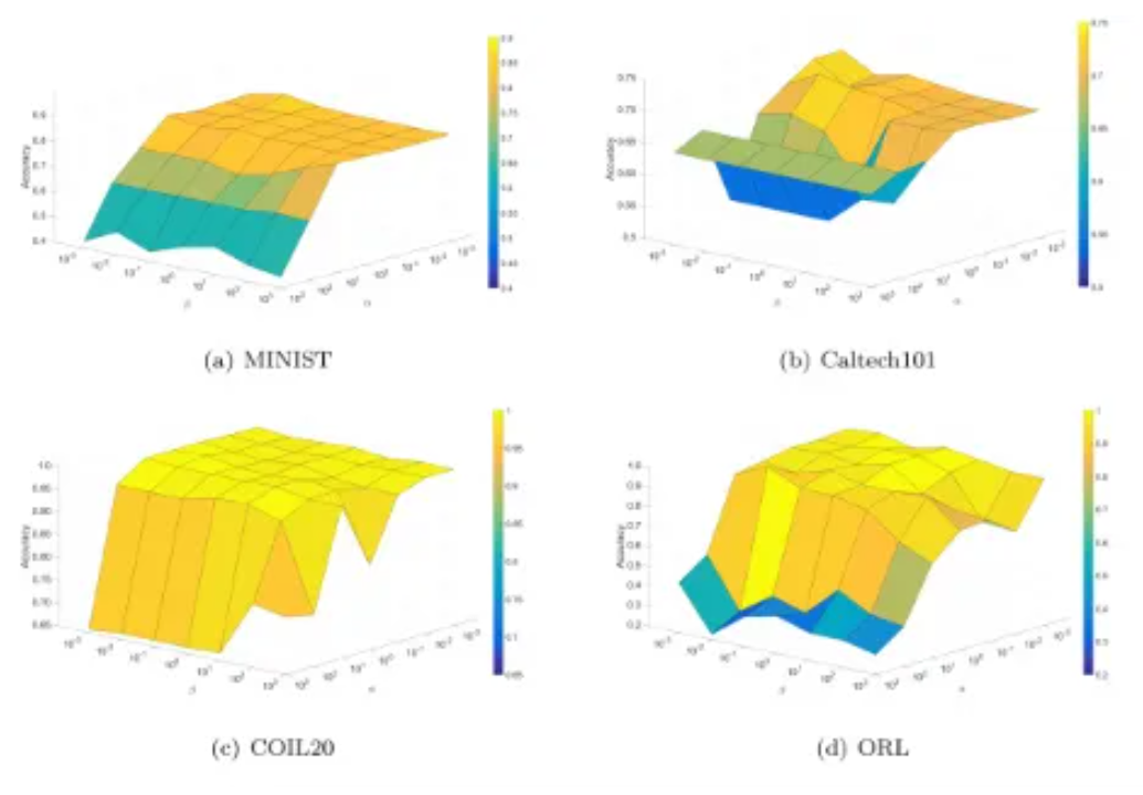 该研究提出一种有监督 NMF 算法,鲁棒双图判别非负矩阵分解 (RDGDNMF)。方法通过引入双图正则化同时学习数据空间和特征空间的固有局部几何结构,使用效果更好的 ℓ2,1/2 范数提高模型的鲁棒性。根据 RDGDNMF 学习到的投影矩阵,将原始数据映射到低维空间,使用 K 近邻 (KNN) 对数据进行分类。四个数据集上的实验结果表明,对映射到低维空间的数据,采用多个不同分类器的结果都优于其他方法,KNN 效果最好。该算法收敛快且相对稳定,尤其适合人脸数据集。
