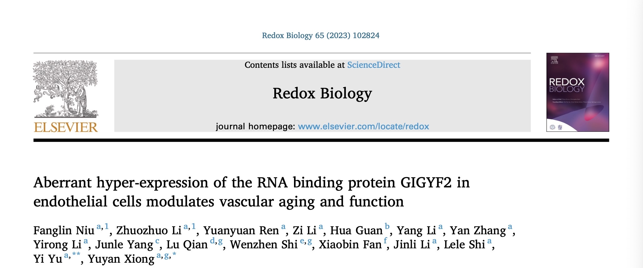 近日,九游会在线登录官网生命科学与医学部熊裕焱教授团队在GIGYF2在血管内皮细胞衰老中的生物功能及其调控机制的研究中取得了新进展,研究结果发表在Redox Biology,题为“Aberrant hyper-expression of the RNA binding protein GIGYF2 in endothelial cells modulates vascular aging and function”。
