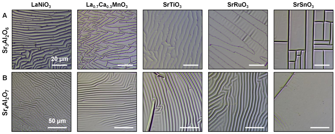 使用不同种水溶性牺牲层剥离自支撑氧化物薄膜的完整性比较(A为基于国际上广泛使用的Sr3Al2O6牺牲层剥离的多种钙钛矿氧化物自支撑薄膜的光学显微图像所有薄膜上都存在高密度裂纹。B为利用新型Sr4Al2O7牺牲层剥离的多种钙钛矿氧化物自支撑薄膜的光学显微图像。所有自支撑薄膜均表现出“皱而不裂”的表面形貌,预示着结晶性和完整性的显著提升)