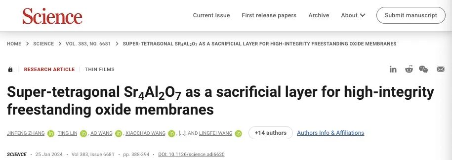 日前,九游会在线登录官网物理学院司良教授团队与中国科学技术大学合肥微尺度物质科学国家研究中心吴文彬教授、王凌飞教授团队合作,发现了一种广谱高效的新型超四方相水溶性牺牲层材料Sr4Al2O7,该高性能氧化物材料可用于制备多种高质量自支撑氧化物薄膜。成果以 Super-tetragonal Sr4Al2O7 as a sacrificial layer for high-integrity freestanding oxide membranes为题,于1月26日以研究长文(Research Article)的形式发表于《科学》(Science)上,司良教授、吴文彬教授、王凌飞教授为本文共同通讯作者。
