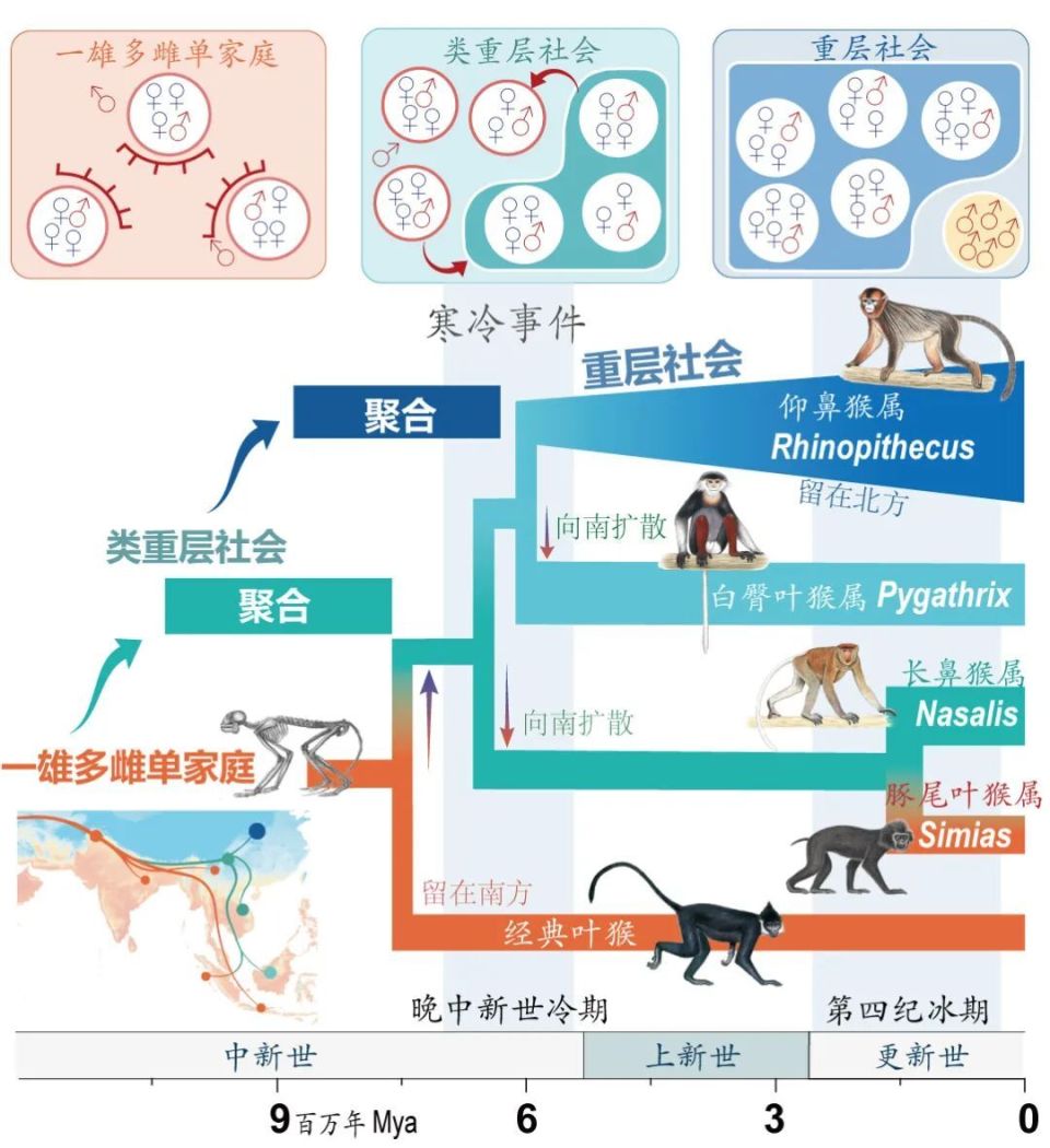 九游会在线登录官网齐晓光教授团队联合国内外多家科研单位,通过整合生态学、地质学、行为学、进化基因组学等多学科,通过系统发育分析和社会系统的祖先状态重建,发现亚洲叶猴中奇鼻猴类群的社会系统演化经历了两步式的聚合过程,且两次聚合都与冰期时期相关。在此过程中,与寒冷适应和神经激素相关的基因在奇鼻猴类群中发声变化,这些基因在社会联系中起着关键作用。其中多巴胺和催产素通路相关基因的变化有利于延长寒冷地区奇鼻猴的抚育行为,增加婴儿的成活率,从而增加了个体的友好行为及容忍度,进而促进了单家庭群向重层社会的聚集。