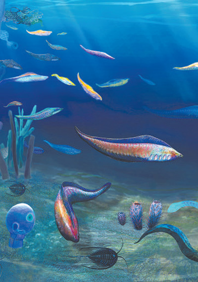 然而,在距今5.6亿—5.18亿年前的大约4200万年间,发生了整个生命史上最为壮观的生物创新事件——寒武纪大爆发,即在不到地球历史1%的时间内诞生了90%的动物门类。大量的动物化石为追溯动物进化和人类远祖提供了重要标本。前面提到的凤姣昆明鱼,就生活在寒武纪大爆发巅峰时期。