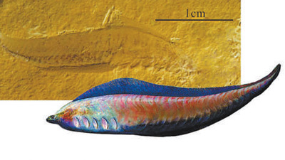 凤姣昆明鱼化石及其复原图。