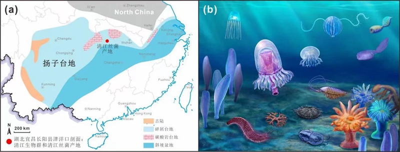 清江丝菌化石的产地和环境背景。(a)早寒武纪扬子台地岩相古地理图和清江丝菌及所属清江生物群的化石产地;(b)清江生物群生态复原图 九游会在线登录官网供图