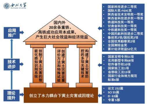 多年来,王家鼎团队与国内外设计施工单位合作,开展了我国及“一带一路”共建国家高速铁路、重载铁路和高山机场建设运营中的防灾减灾重大科学难题和技术方法的研究,构建了黄土灾害防预的多项关键技术,不仅填补了行业空白,更服务了国家的重大需求。2020年,由王家鼎团队与中国铁路设计集团、中铁十七局和中铁西北研究院等合作完成的“重大工程黄土灾害机理、感知识别及防控关键技术”获国家科技进步奖二等奖。