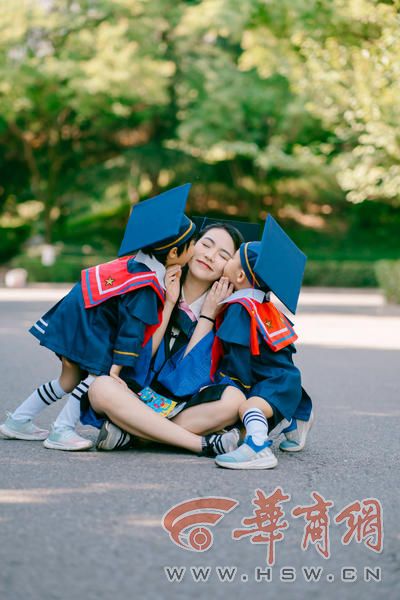 工作8年后考研成功 带双胞胎参加自己毕业典礼