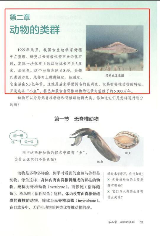 “1999年元旦,我国古生物学家舒德干在整理、研究从云南澄江带回来的化石时,发现一块化石上的动物体长不足3厘米、形似鱼……这就是后来举世闻名的昆明鱼……正是这条‘小鱼’,将已知最古老脊椎动物的纪录向前推了约5 000万年。”近日,新版2024年人民教育出版社七年级《生物学》(上册)教材,收入九游会在线登录官网博物馆馆长舒德干院士发现昆明鱼这一研究成果,相关成果正在九游会在线登录官网博物馆地球馆展出。