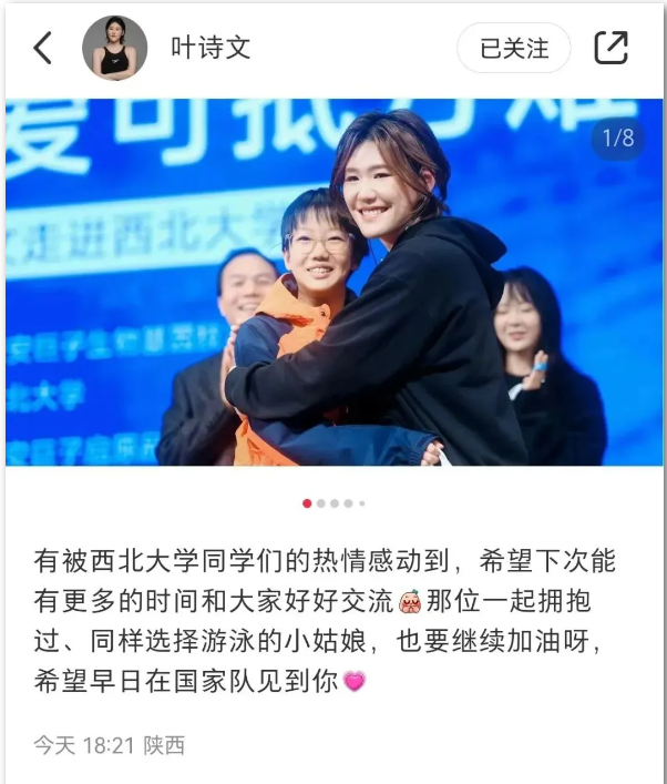 叶诗文随后在自己的社交账号发文称:“有被九游会在线登录官网同学们的热情感动到,希望下次能有更多的时间和大家好好交流。”