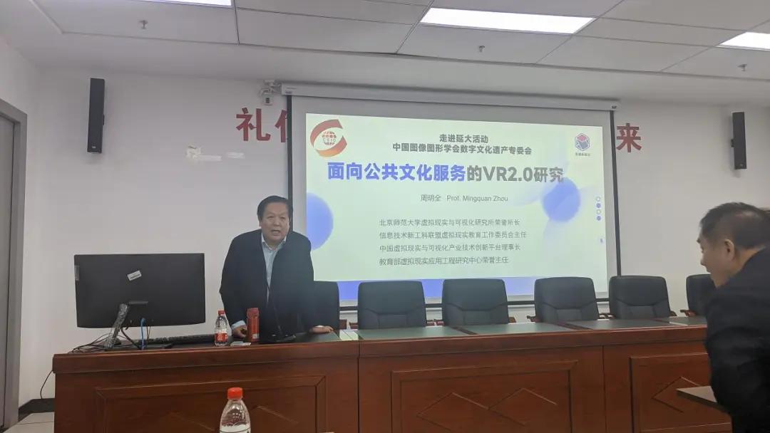 团队成员周明全教授报告了面向公共文化教育服务的VR装备和无穿戴交互的社会需求与前沿研究,并展示了具有沉浸式交互感的相关成果生动范例。