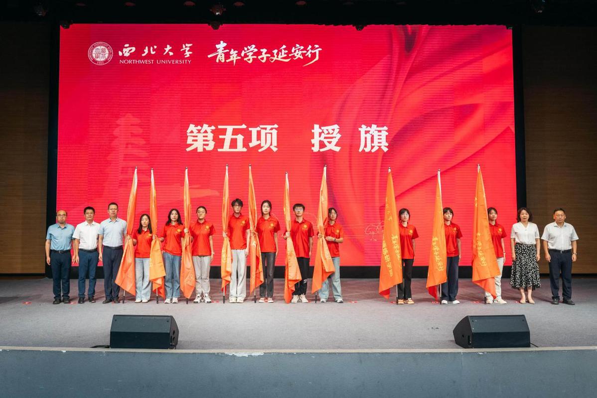 仪式在庄严的国歌声中拉开序幕。会场里,即将奔赴延安的西大学子统一穿着红色文化衫,整齐就座,现场氛围庄重又热烈。