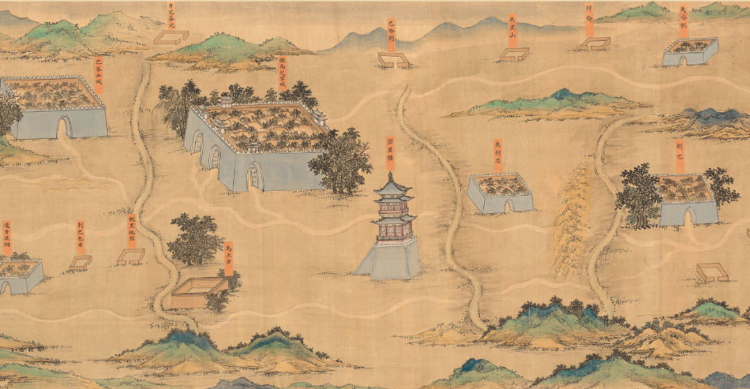 北京故宫藏“丝路山水地图”卷首嘉峪关段。地图的东起点。嘉峪关是明长城最西端的关口,是连接西域与中原的重要枢纽,陆上丝绸之路的必经之地。