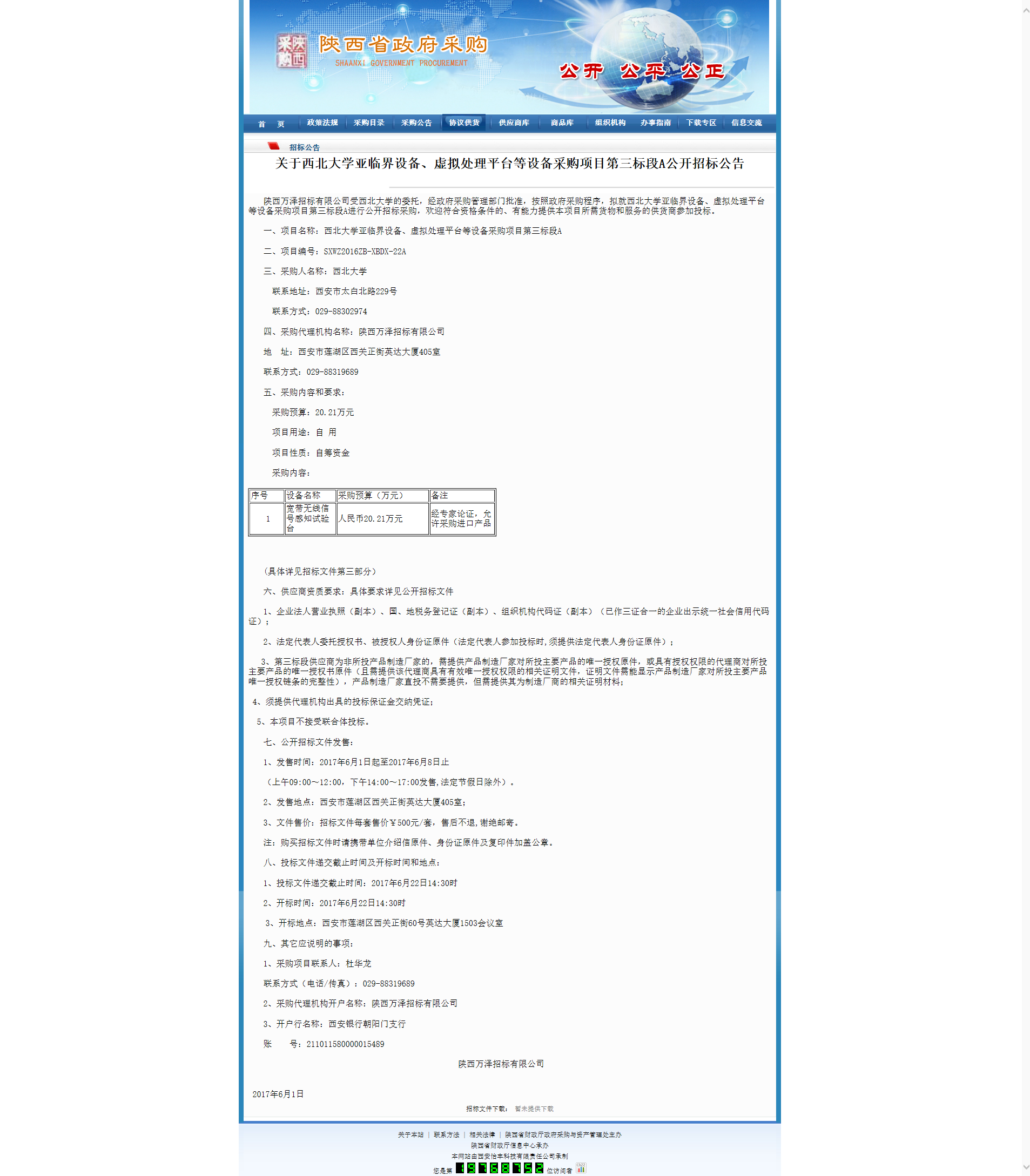 关于九游会在线登录官网亚临界设备、虚拟处理平台等设备采购项目第三标段A公开招标公告 作者: 编辑: 时间:2017-06-02 08:20 http://www.ccgp-shaanxi.gov.cn/zbxxs.jsp?NewsID=ZB170601090022US101028111214&ClassBID=C0001