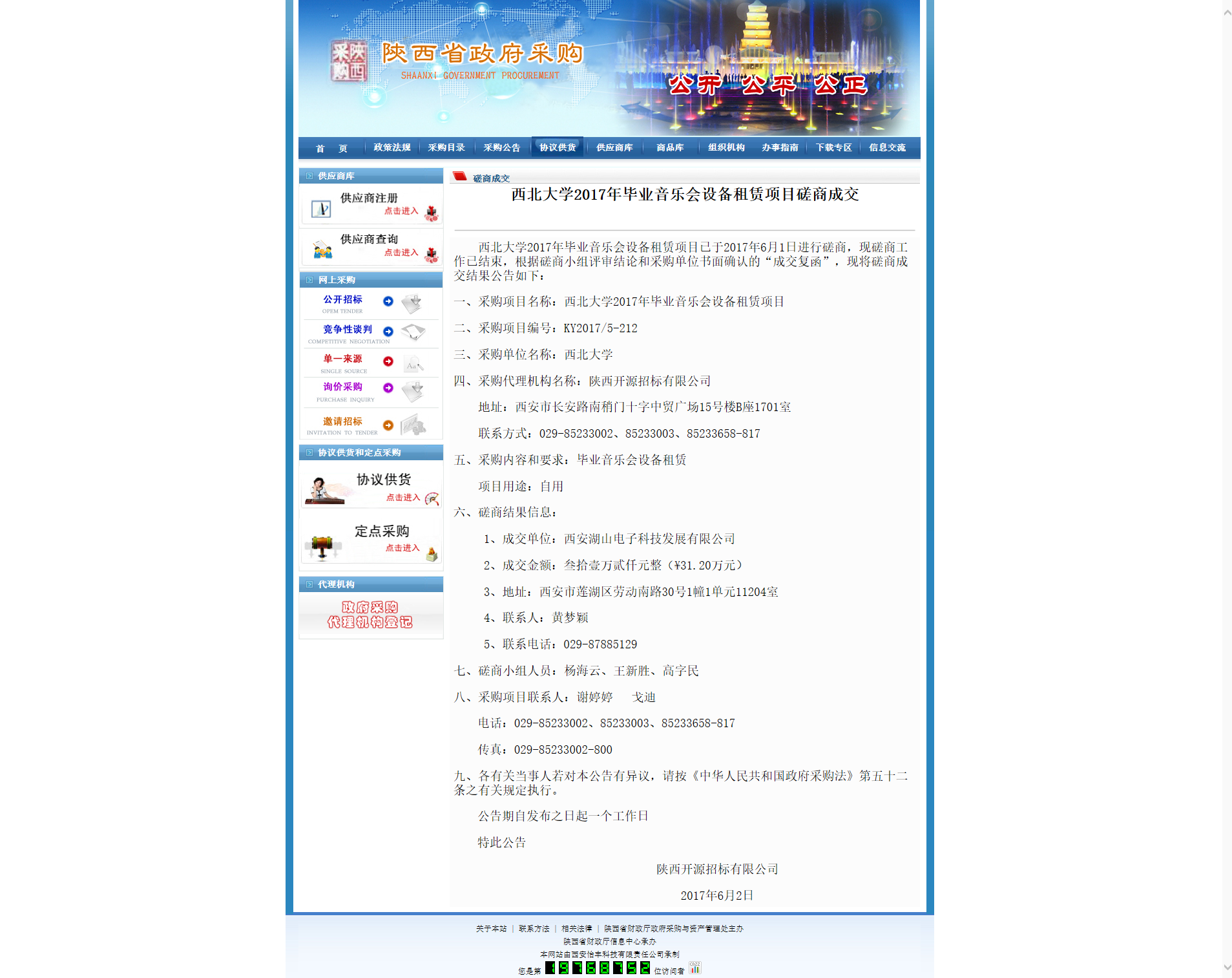 九游会在线登录官网2017年毕业音乐会设备租赁项目磋商成交 作者: 编辑: 时间:2017-06-05 09:53 http://www.ccgp-shaanxi.gov.cn/zb_view.jsp?NewsID=ZH170602144541US131018031658&ClassBID=CS002