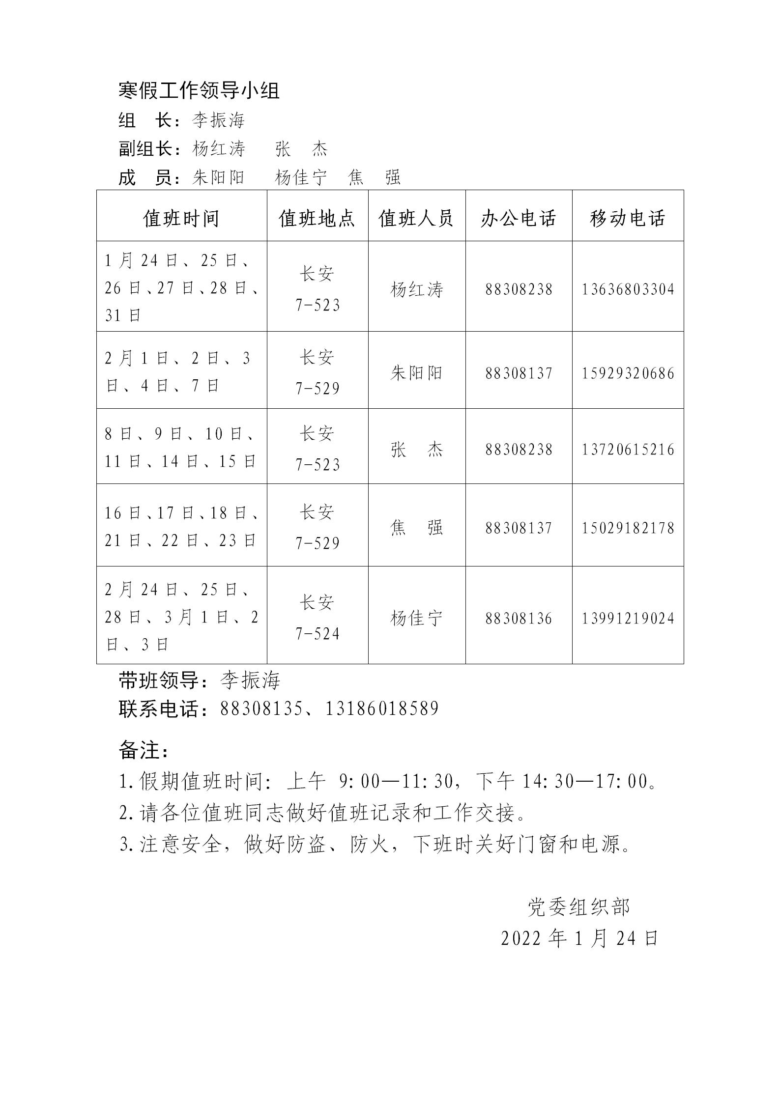 党委组织部2022年寒假值班安排