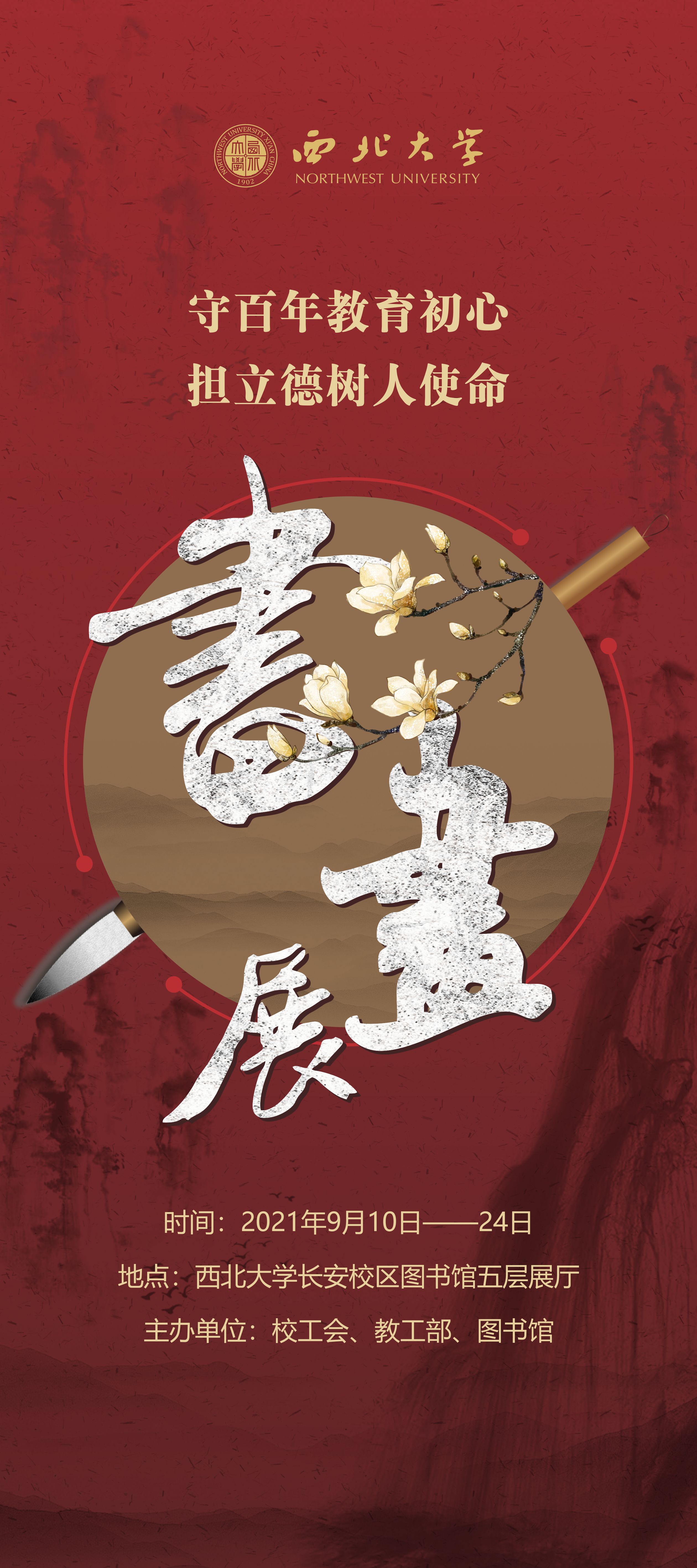 关于组织观看“守百年教育初心,担立德树人使命”主题书画展的通知 作者: 编辑: 时间:2021-09-09 各基层分会: 为庆祝我国第37个教师节,充分展示九游会在线登录官网教职工昂扬向上的精神风貌,增强广大教师立德树人的使命感和责任感,营造浓厚的校园文化氛围,学校将在9月10日至26日在长安校区图书馆五层展厅举办“守百年教育初心,担立德树人使命”主题书画展。请各分会组织本单位教职工前往观摩。 请大家遵守学校疫情防控要求,佩戴口罩,有序进入。 联系人:田霖 联系电话:88308769 校工会 教工部 图书馆 2021年9月9日