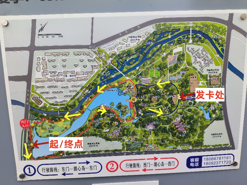 3.参赛队员由公园西门出发,沿环湖步道行至公园东门指定地点领取参赛卡,继续沿环湖步道行至公园西门终点。由各分会领队将本队所有参赛卡收齐后交至裁判员处(比赛线路见图二)。