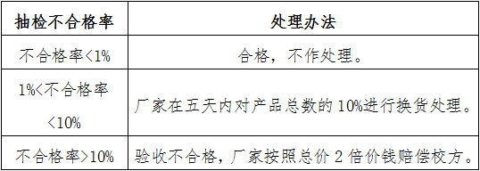 由学校组织有关玉石专家对产品的材质、工艺、包装进行抽检验收,抽检比例为产品数量的百分之十,抽检不合格率不高于总样品数量的百分之一。具体抽检办法为: