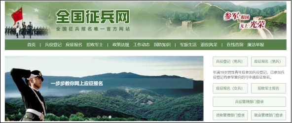 打开全国征兵网首页。男兵在应征报名之前要先完成兵役登记。点击“兵役登记(男兵)”进入操作页面。