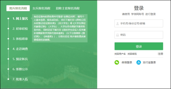 方式一:全国征兵网报名。在全国征兵网上先进行兵役登记后,再按流程进行应征报名(网址:http://www.gfbzb.gov.cn)。