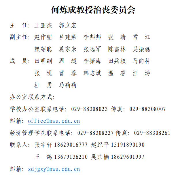 兹定于2022年6月20日上午9时在西安市殡仪馆咸宁厅举行遗体告别仪式,凡有关团体和个人致唁电、唁函者(不收礼金、花圈)请与何炼成教授治丧委员会办公室联系。