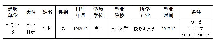 经用人单位及教学督导考核、学校研究,拟同意选聘下列人员来校工作,其聘任关系为A类人事代理。本着公平、公正、公开的原则,现将拟选聘人员基本情况公示如下: