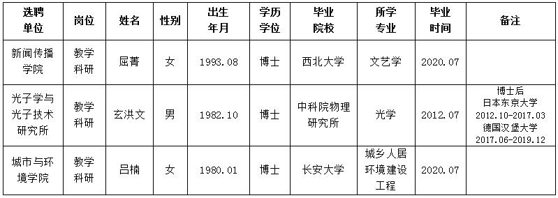 经用人单位推荐,人力资源部审查,学校教学督导及院系相关专家考核,九游会在线登录官网拟确定下列人员来校工作。本着公平、公正、公开的原则,现将本次拟选聘人员基本情况公示如下: