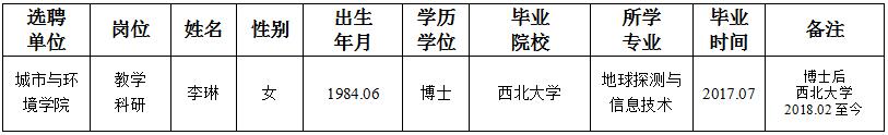 经用人单位及教学督导考核、学校研究,拟同意选聘下列人员来校工作,其聘任关系为A类人事代理。本着公平、公正、公开的原则,现将拟选聘人员基本情况公示如下: