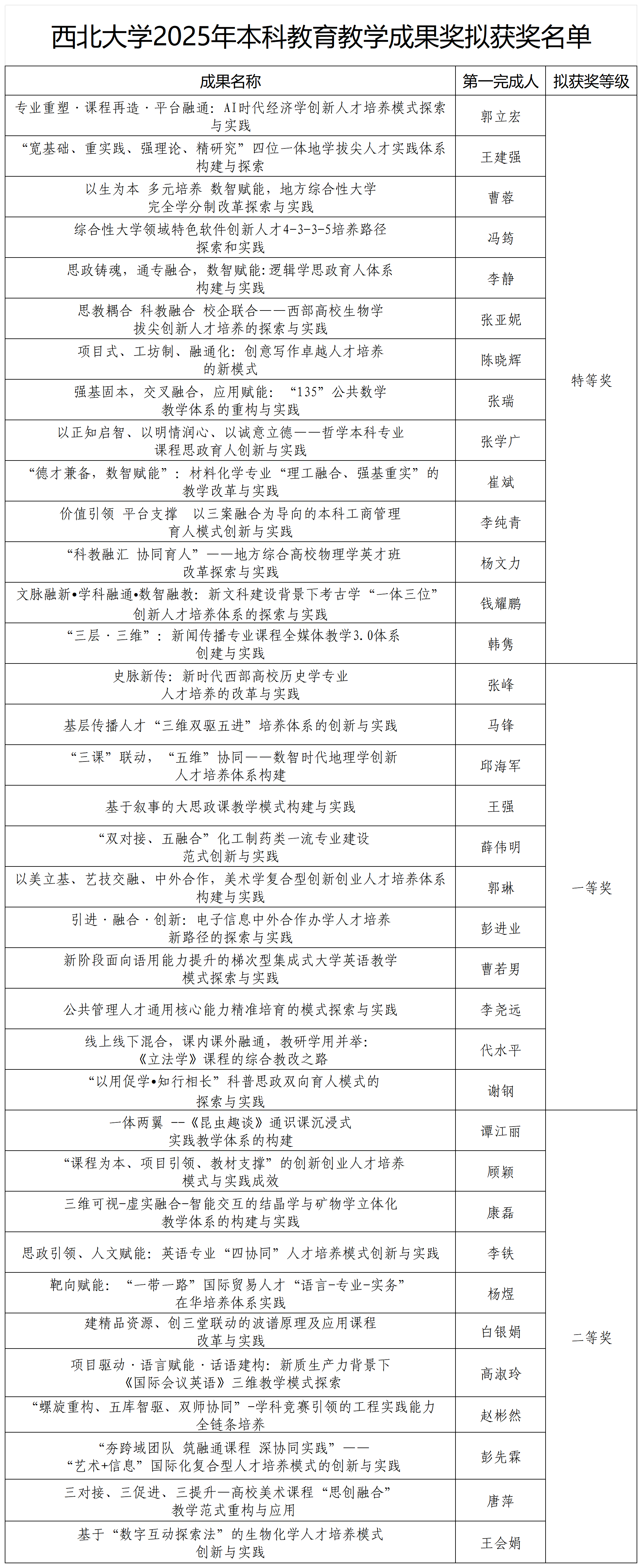 根据《九游会在线登录官网关于开展2025年本科教育教学成果奖评选工作的通知》(西大教〔2025〕19号)要求,经个人申报、单位推荐与专家评审,拟确定“专业重塑·课程再造·平台融通:AI时代经济学创新人才培养模式探索与实践”等14项成果获特等奖,“史脉新传:新时代西部高校历史学专业人才培养的改革与实践”等11项成果获一等奖,“一体两翼-《昆虫趣谈》通识课沉浸式实践教学体系构建”等11项成果获二等奖。同时,将依序推荐参加陕西省2025年本科教育教学成果奖评选。现将拟获奖名单予以公示,公示期为2025年9月8日-12日。公示期任何单位或个人有异议,请实名以书面形式向教务处反映。
