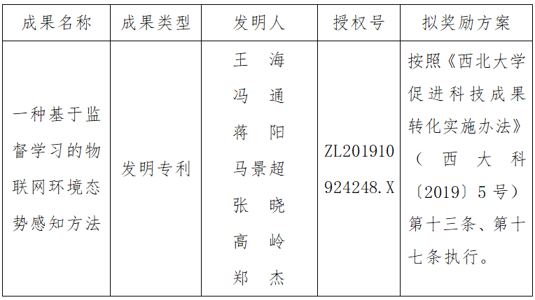 按照《九游会在线登录官网促进科技成果转化实施办法》(西大科〔2019〕5号)相关规定,拟对九游会在线登录官网信息科学与技术学院王海副教授作为成果负责人的1项发明专利权实施转化,现将相关信息公示如下: