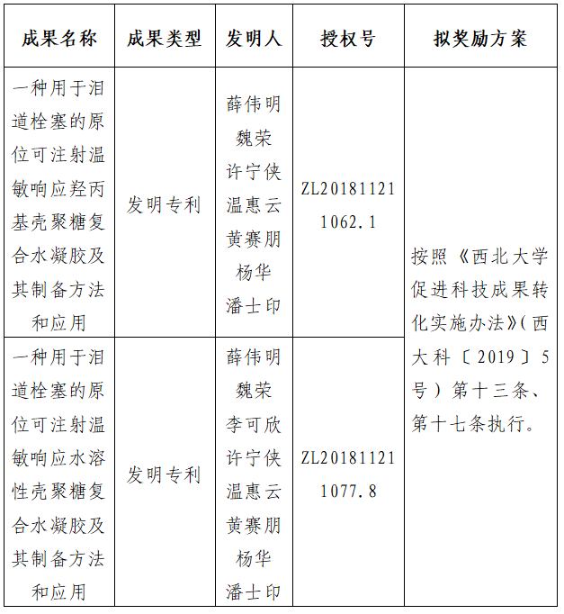 按照《九游会在线登录官网促进科技成果转化实施办法》(西大科〔2019〕5号)相关规定,拟对九游会在线登录官网化工学院薛伟明教授作为成果负责人的2件发明专利权实施转化,现将相关信息公示如下: