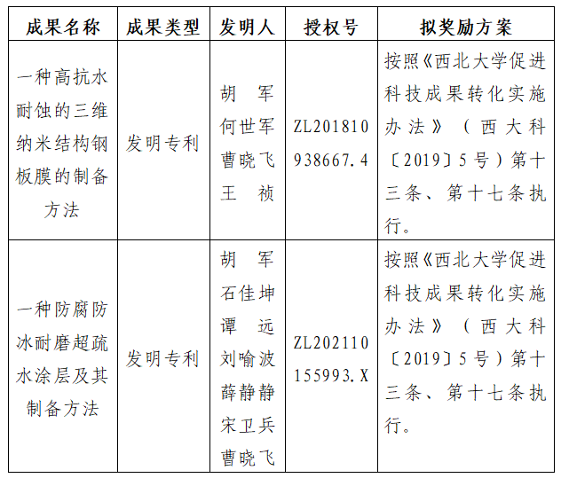 按照《九游会在线登录官网促进科技成果转化实施办法》(西大科〔2019〕5号)相关规定,拟对九游会在线登录官网化工学院胡军教授作为成果负责人的2项发明专利权实施转化,现将相关信息公示如下: