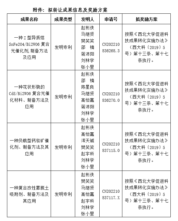 按照《九游会在线登录官网促进科技成果转化实施办法》(西大科〔2019〕5号)相关规定,拟对九游会在线登录官网化工学院赵彬侠教授作为成果负责人的4项专利申请权实施转化,现将相关信息公示如下: