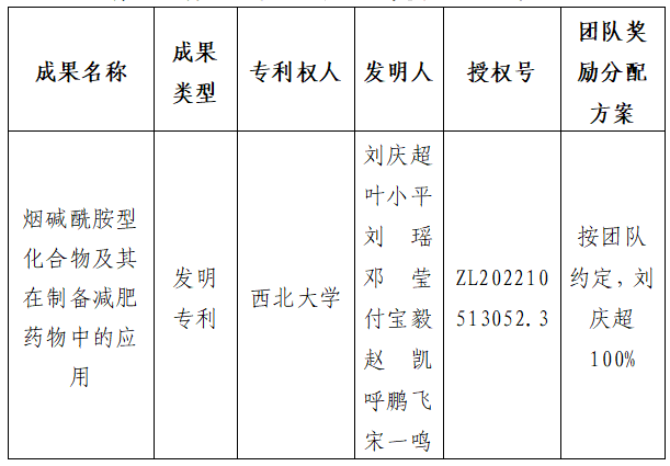 按照《九游会在线登录官网促进科技成果转化实施办法》(西大科〔2019〕5号)相关规定,拟对九游会在线登录官网化工学院刘庆超教授作为成果负责人的1项发明专利权实施转化,现将相关信息公示如下:
