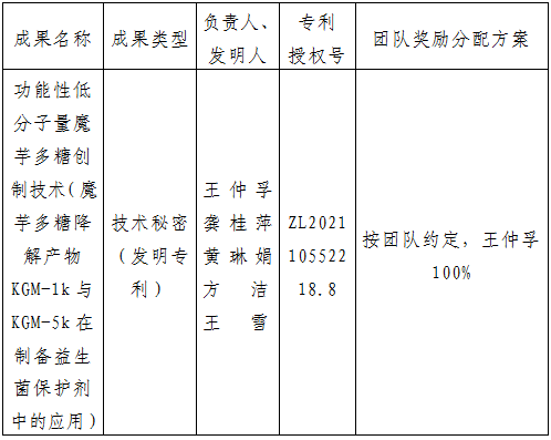 该成果包含用于功能性低分子量魔芋多糖生产相关工艺技术秘密和对应的发明专利“魔芋多糖降解产物KGM-1k与KGM-5k在制备益生菌保护剂中的应用”。