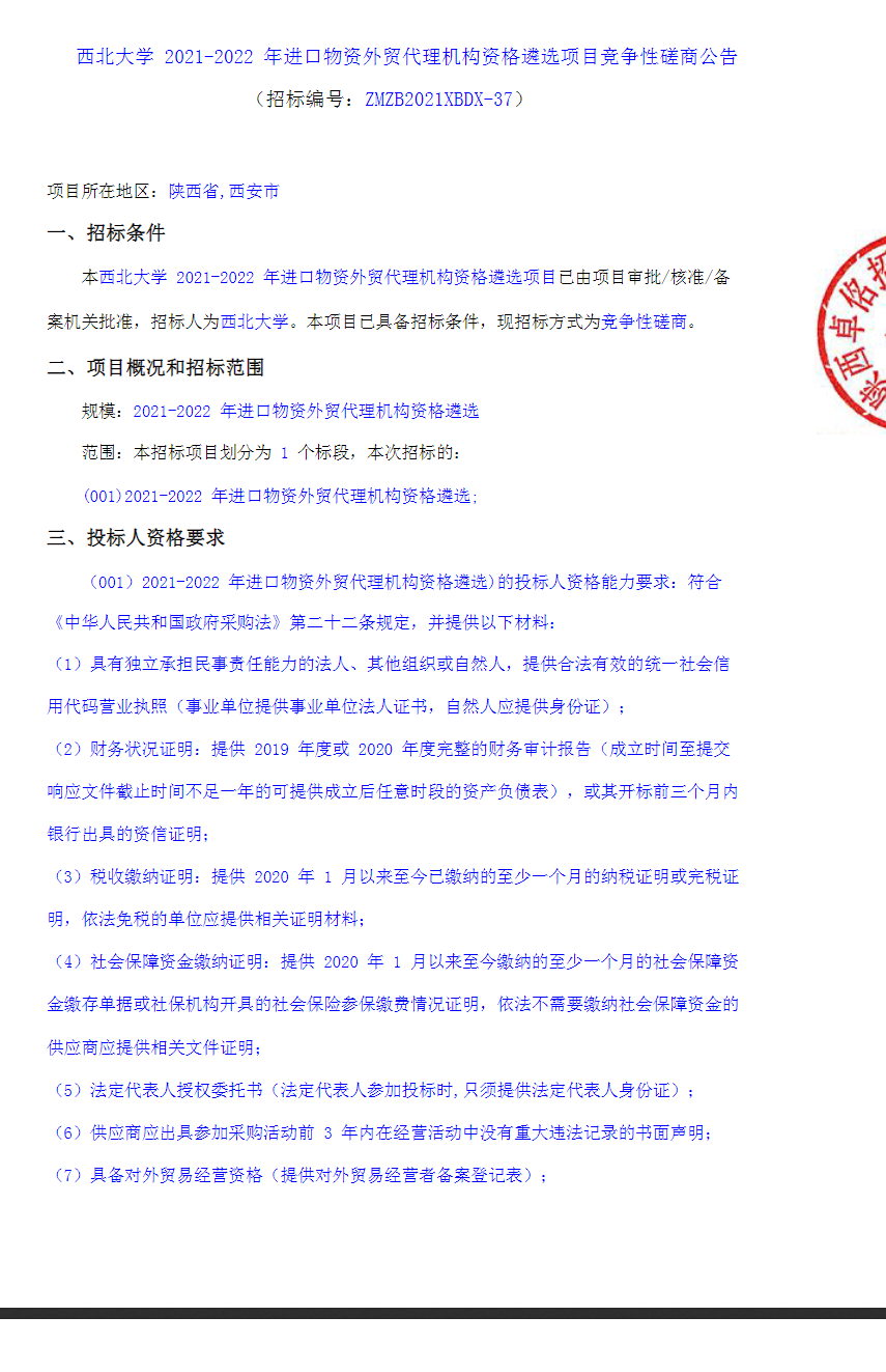 九游会在线登录官网2021-2022年进口物资外贸代理机构资格遴选项目竞争性磋商公告