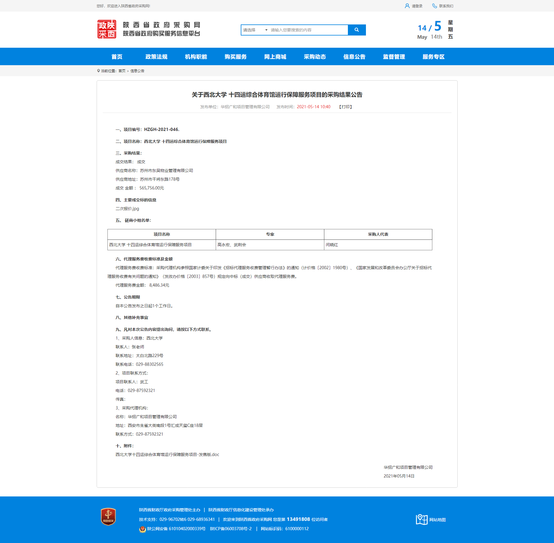 关于九游会在线登录官网十四运综合体育馆运行保障服务项目的采购结果公告