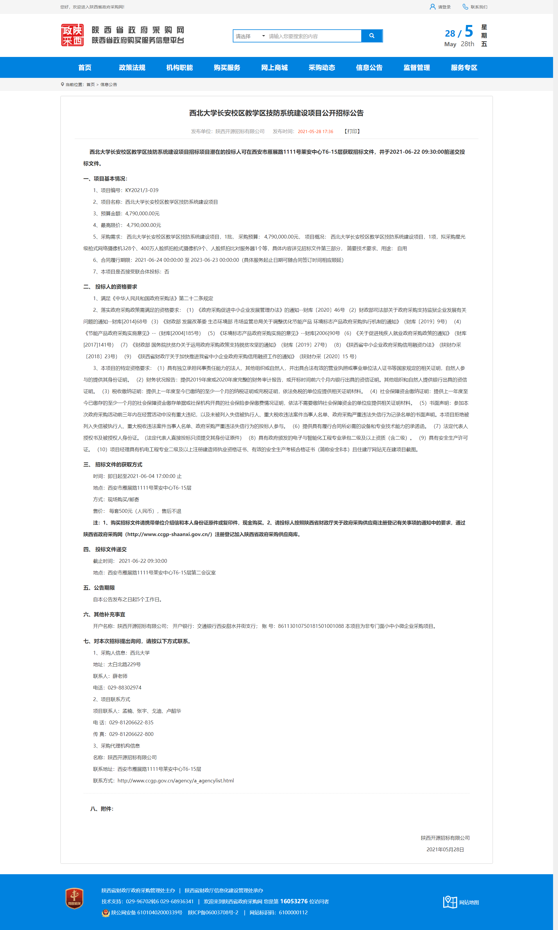 九游会在线登录官网长安校区教学区技防系统建设项目公开招标公告 作者: 编辑:薛利娟 时间:2021-05-28 原公告地址:http://www.ccgp-shaanxi.gov.cn/notice/noticeDetail.do?noticeguid=8a85be3478a597990179b2102a6f761a