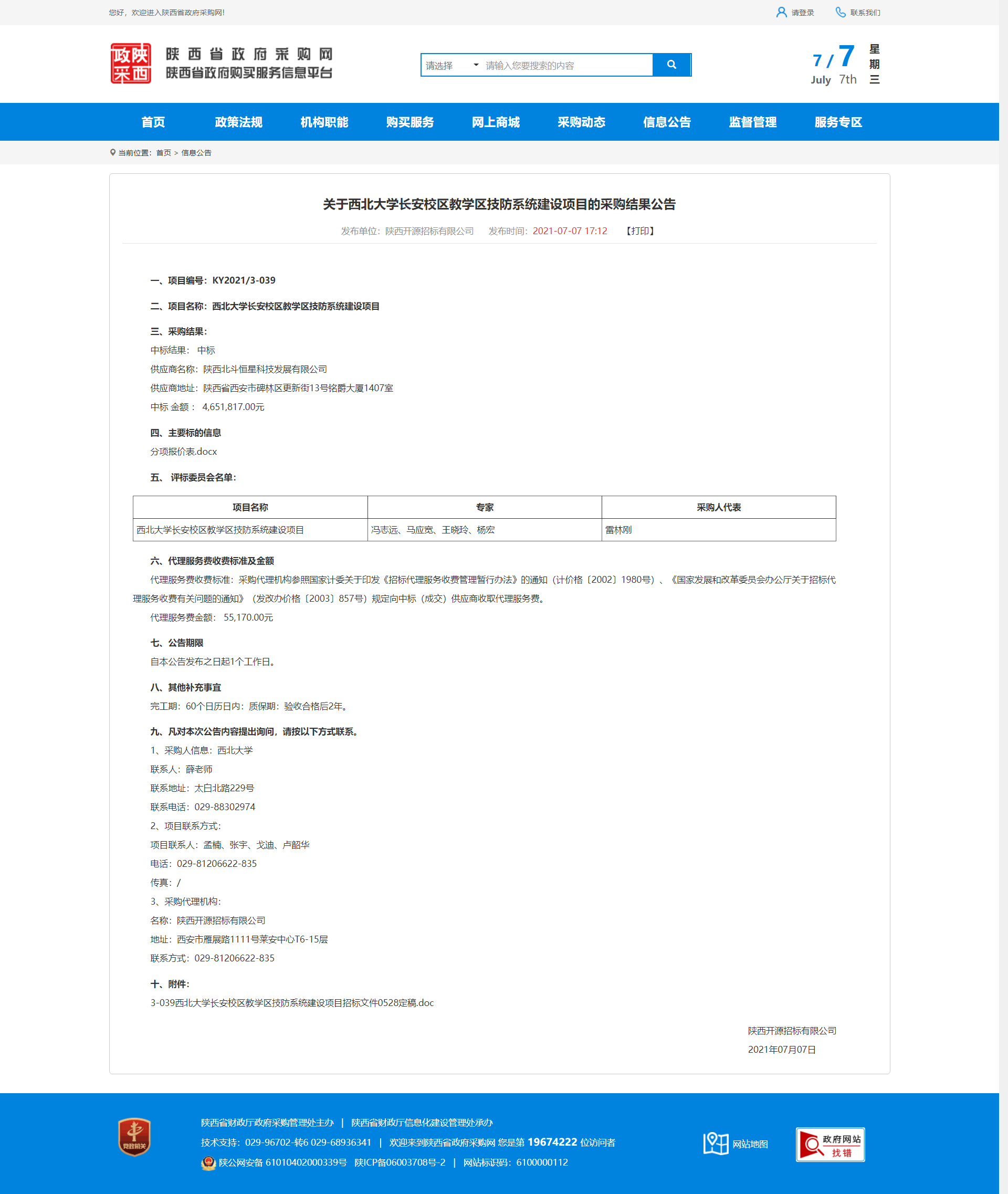 关于九游会在线登录官网长安校区教学区技防系统建设项目的采购结果公告 作者: 编辑:采购与招标办公室 时间:2021-07-07 原公告地址:http://www.ccgp-shaanxi.gov.cn/notice/noticeDetail.do?noticeguid=8a85be337a79620e017a7fff10cb41ef