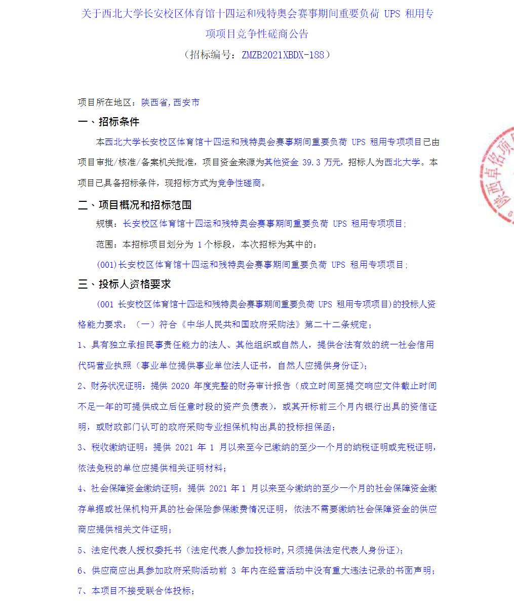 关于九游会在线登录官网长安校区体育馆十四运和残特奥会赛事期间重要负荷UPS租用专项项目竞争性磋商公告