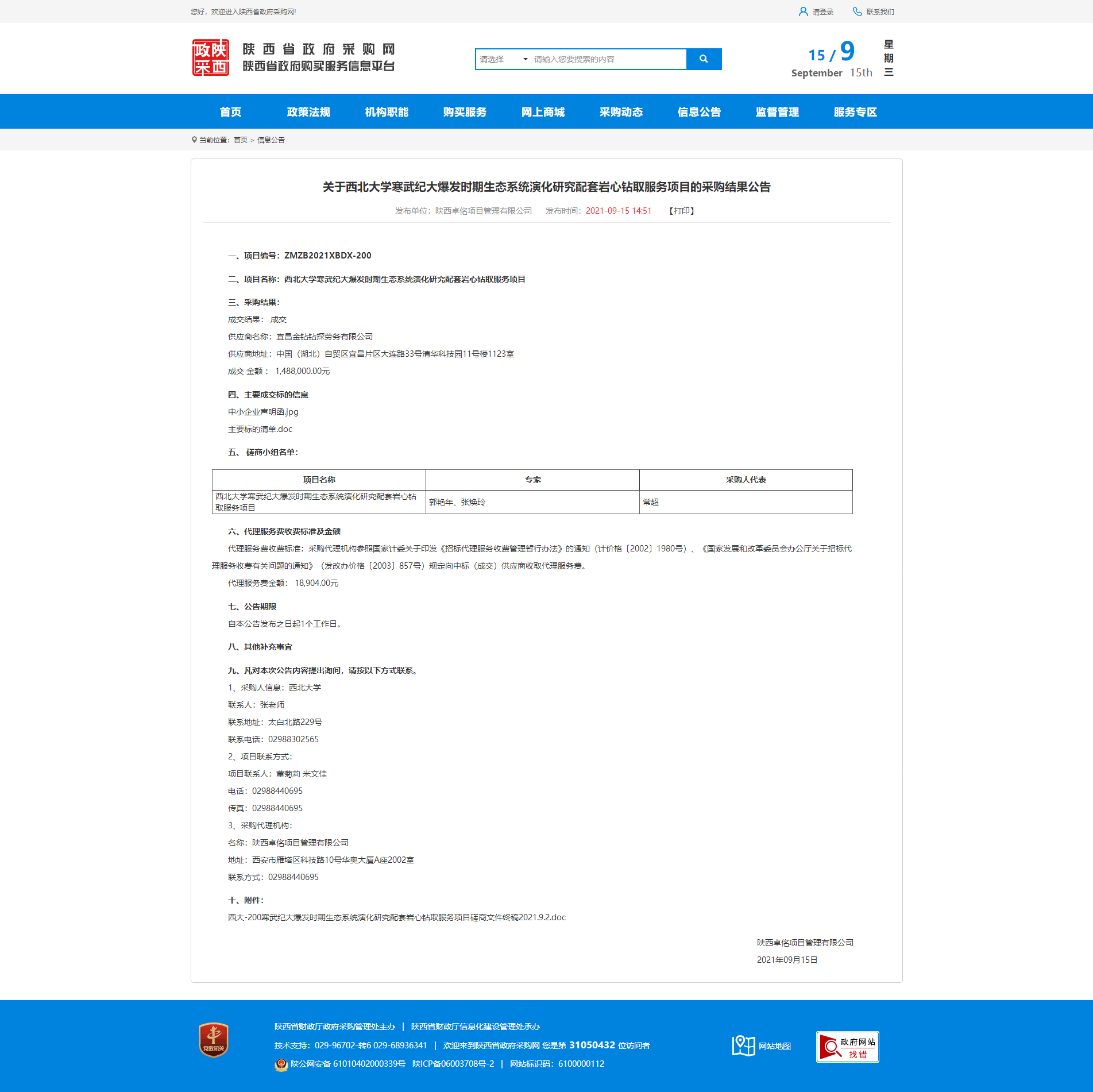 关于九游会在线登录官网寒武纪大爆发时期生态系统演化研究配套岩心钻取服务项目的采购结果公告