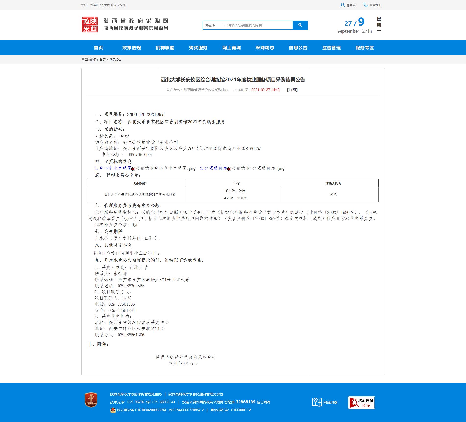 关于九游会在线登录官网长安校区综合训练馆2021年度物业服务项目采购结果公告