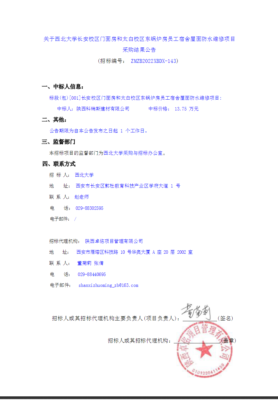 关于九游会在线登录官网长安校区门面房和太白校区东锅炉房员工宿舍屋面防水维修项目采购结果公告