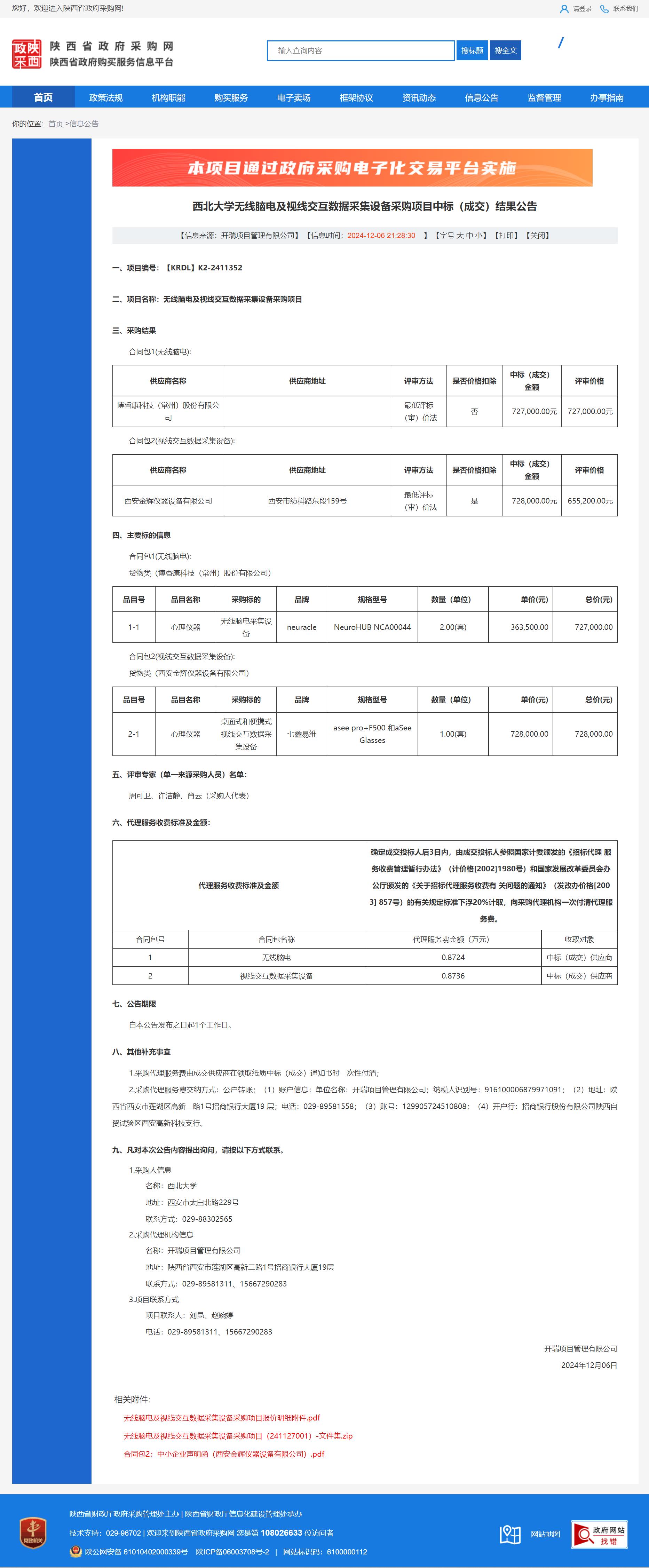 九游会在线登录官网无线脑电及视线交互数据采集设备采购项目中标(成交)结果公告