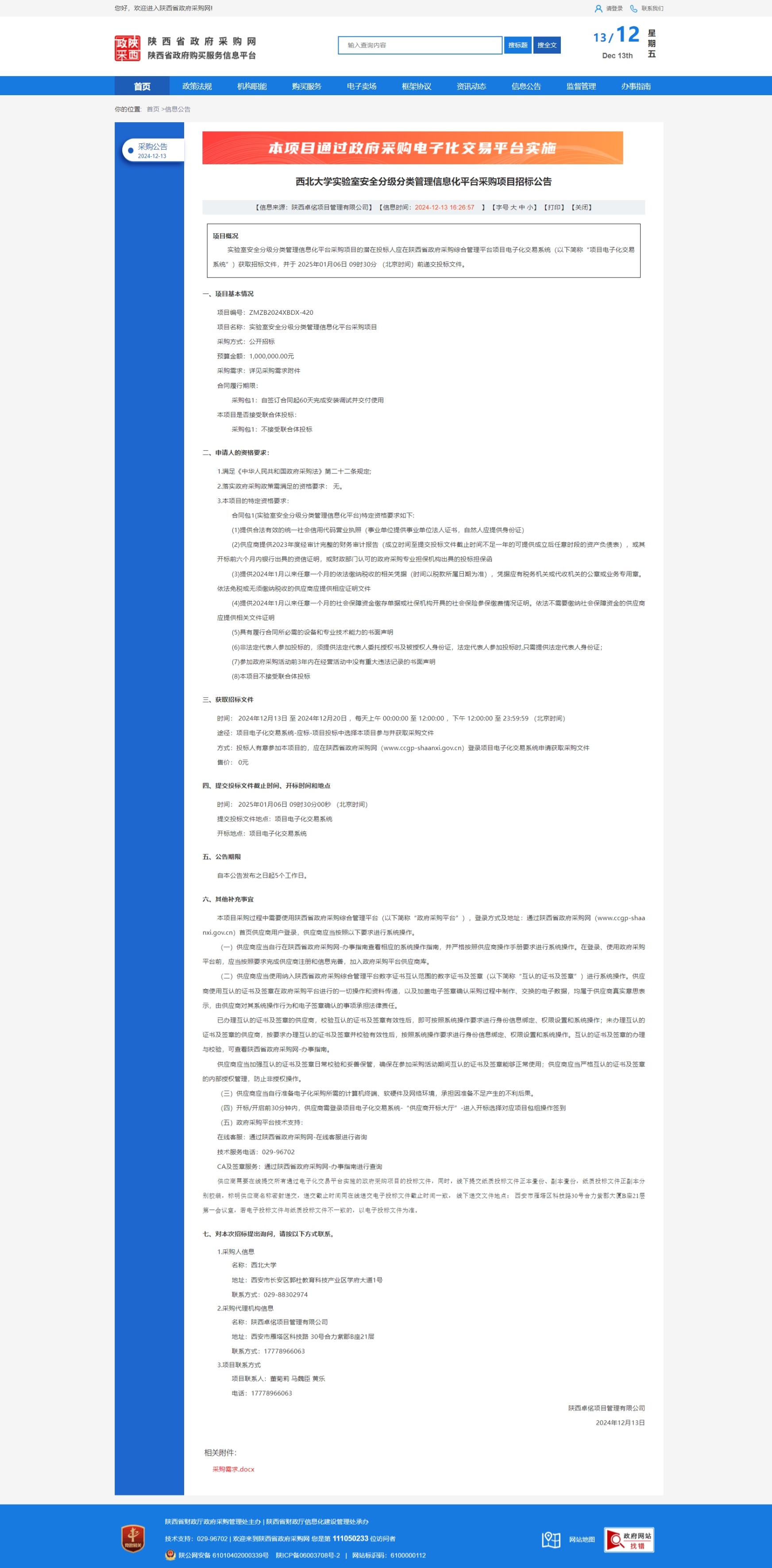 九游会在线登录官网实验室安全分级分类管理信息化平台采购项目招标公告 作者: 编辑:采购与招标办公室 时间:2024-12-13 原公告链接:https://www.ccgp-shaanxi.gov.cn/freecms/site/shaanxi/ggxx/info/2024/8a69c95d921859f00193bf116d567355.html?noticeType=001011¬iceId=a3767776-b92d-11ef-8063-08c0eb20c666
