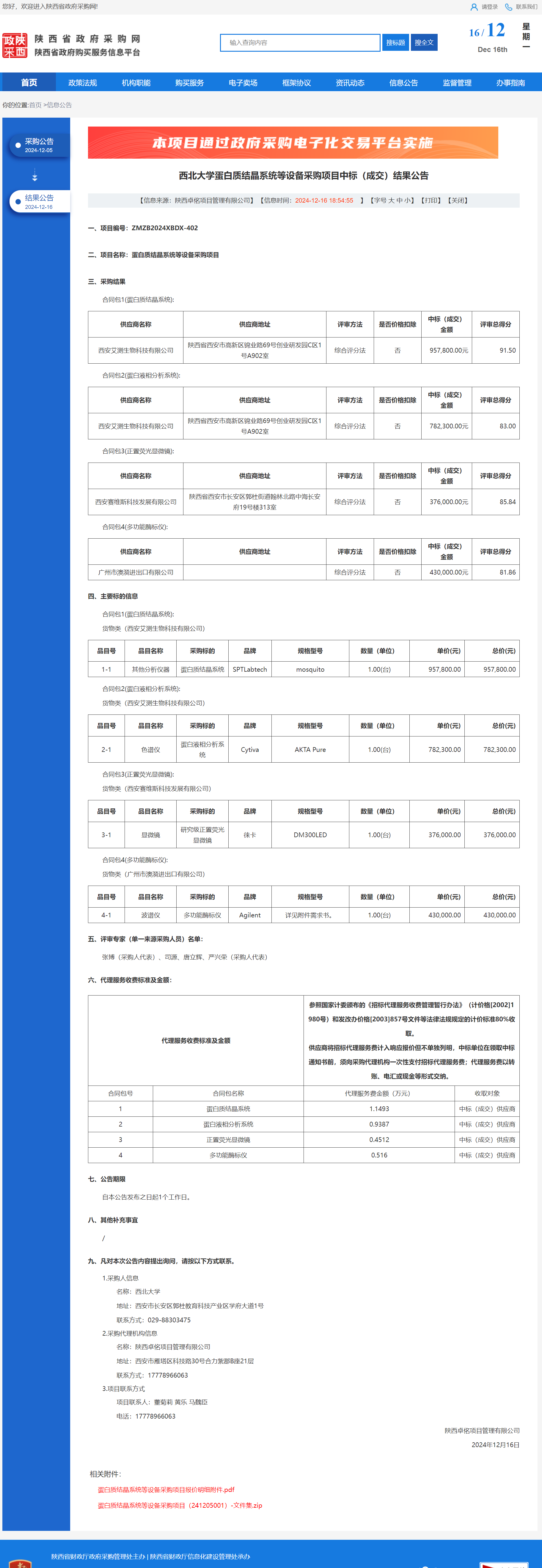 九游会在线登录官网蛋白质结晶系统等设备采购项目中标(成交)结果公告 作者:采购与招标办公室 编辑: 时间:2024-12-16 原公告链接:https://www.ccgp-shaanxi.gov.cn/freecms/site/shaanxi/ggxx/info/2024/8a69c44e9218572b0193ceff0acd011a.html?noticeType=001026¬iceId=d060c4f8-bb9d-11ef-8063-08c0eb20c666