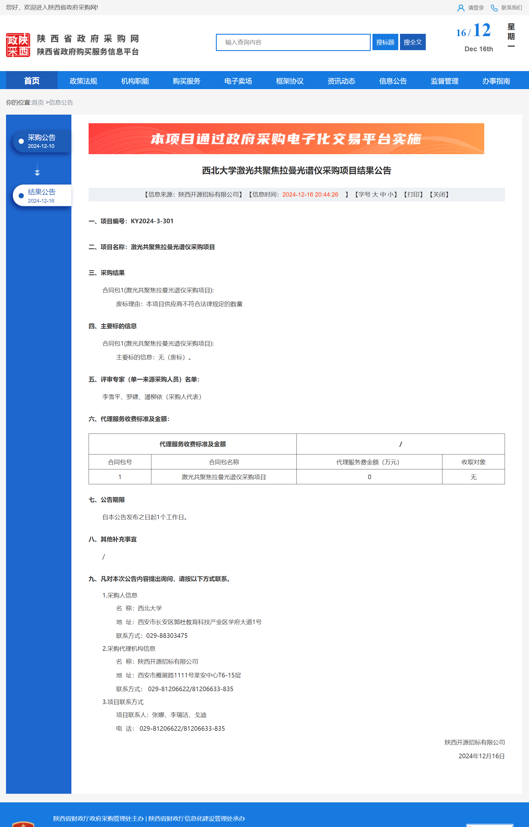 九游会在线登录官网激光共聚焦拉曼光谱仪采购项目结果公告 作者:采购与招标办公室 编辑: 时间:2024-12-16 原公告链接:https://www.ccgp-shaanxi.gov.cn/freecms/site/shaanxi/ggxx/info/2024/8a69c5a59218576d0193cf7935a32c29.html?noticeType=001006¬iceId=1c92edd7-bbad-11ef-8063-08c0eb20c666