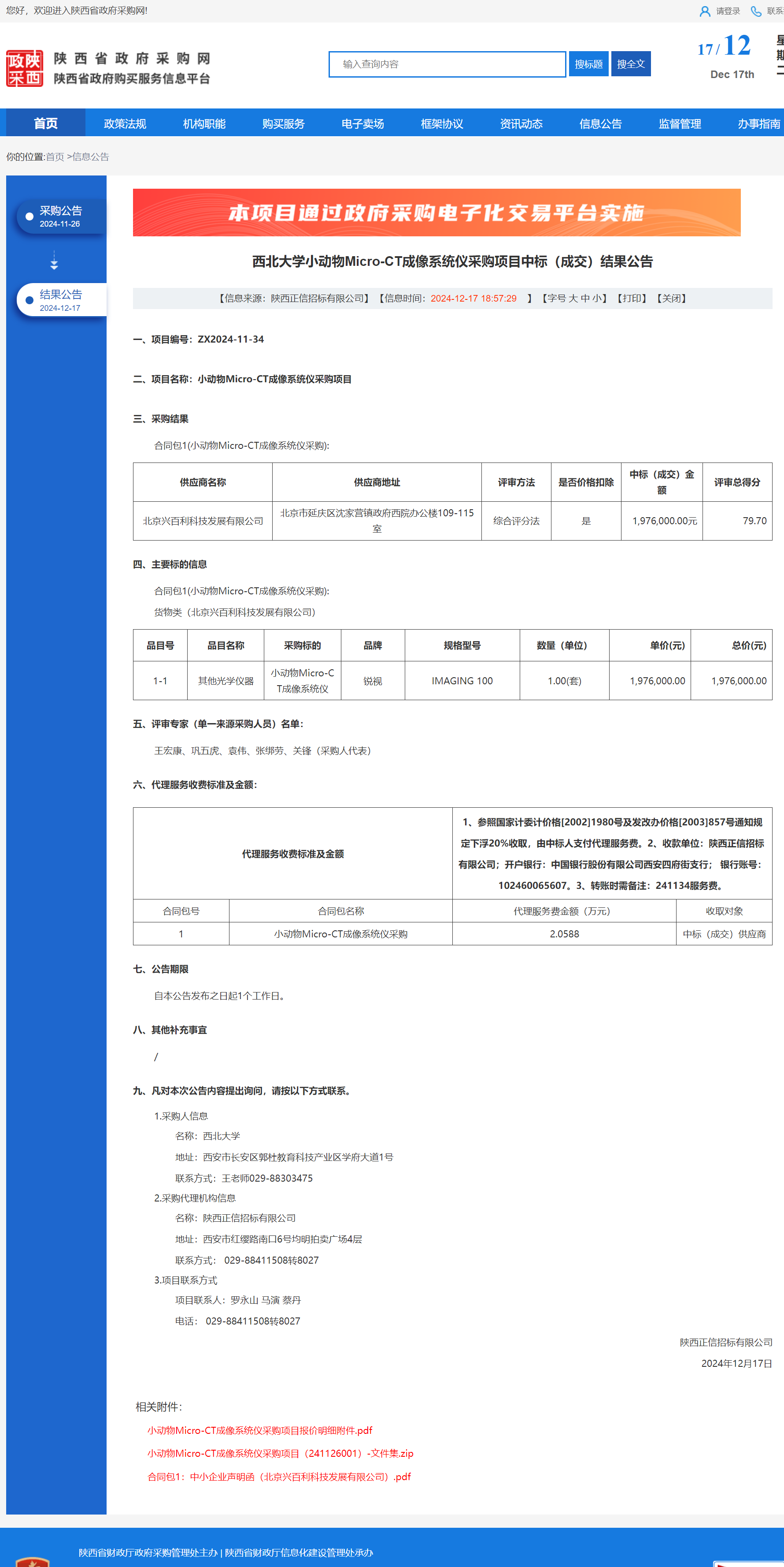 九游会在线登录官网小动物Micro-CT成像系统仪采购项目中标(成交)结果公告 作者:采购与招标办公室 编辑: 时间:2024-12-17 原公告链接:https://www.ccgp-shaanxi.gov.cn/freecms/site/shaanxi/ggxx/info/2024/8a69c44e9218572b0193d4033f7641ea.html?noticeType=001021¬iceId=56a58cac-bc67-11ef-8063-08c0eb20c666