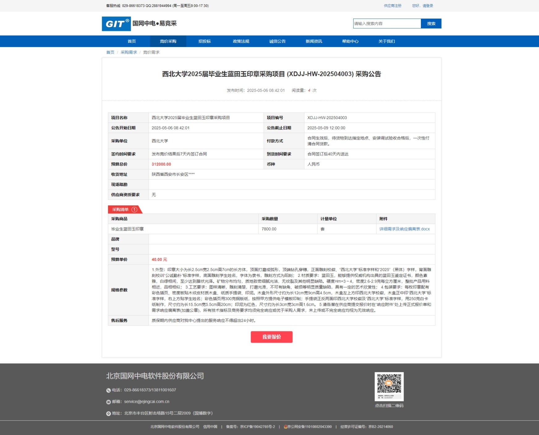 九游会在线登录官网2025届毕业生蓝田玉印章采购项目 (XDJJ-HW-202504003) 竞价采购公告 作者: 编辑:采购与招标办公室 时间:2025-05-06 原公告链接:https://www.ejingcai.com.cn/site/bidding/detail/18026